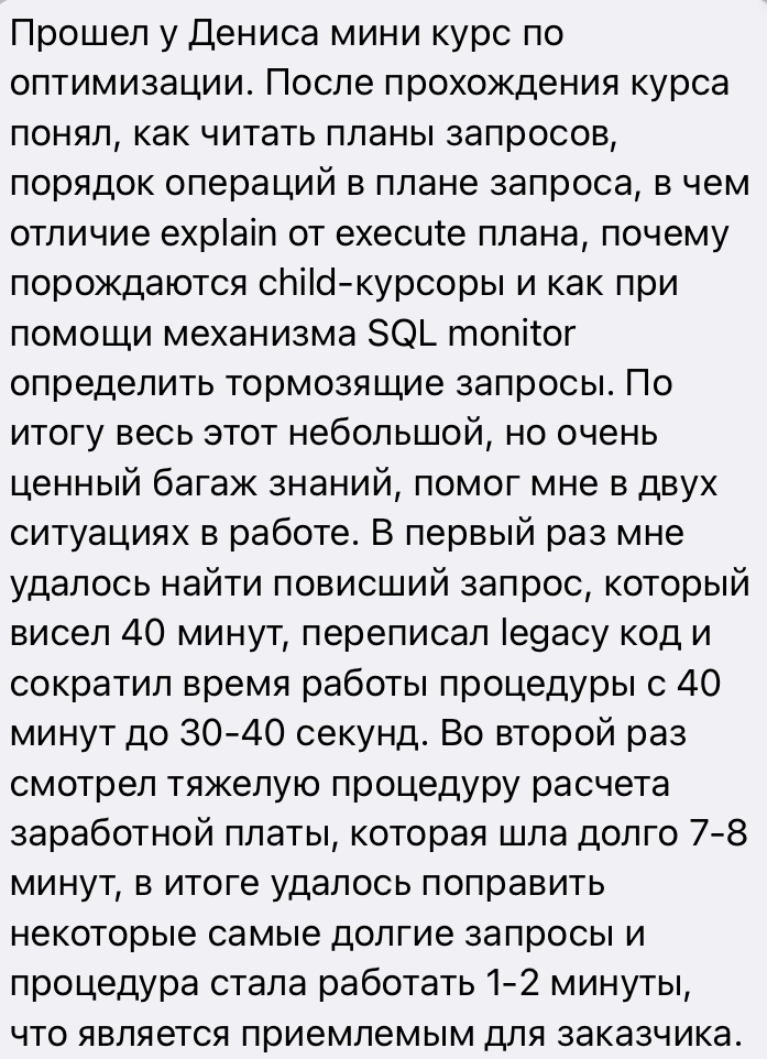 Главное, что Олег уносит с собой: перенастроенный взгляд. Не «приёмы», а логика. Не «как заставить базу», а как договориться с оптимизатором на языке цифр. С этого момента у него начинается совершенно другая работа.