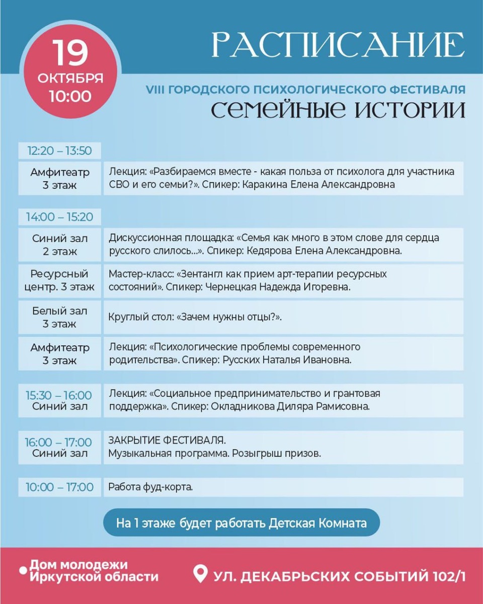 В День отца в Иркутске состоится фестиваль «Семейные истории» 19 октября в Иркутске в Доме молодёжи в честь Дня отца пройдёт VIII Городской психологический фестиваль «Семейные истории». В числе организаторов – «Женское движение Единой России», общественные объединения психологов, Совет отцов Иркутской области и другие. - В этом году решили провести ставший уже традиционным психологический фестиваль «Семейные истории» в День отца. Мы всех ждём, чтобы пообщаться на разные темы – прежде всего о семье, взаимоотношениях, роли женщины, роли мужчины, о том, как семья может поддержать даже тех ребят, которые выполняют задачу в очень серьезных и сложных условиях, защищая нашу с вами страну, наше с вами спокойствие. Именно семья для них, как и для всех остальных, является основной опорой, - рассказала региональный координатор партпроекта «Женское движение Наталья Дикусарова. Одна из площадок фестиваля будет посвящена теме поддержки участников СВО, поддержке их семей. В её работе примут участи