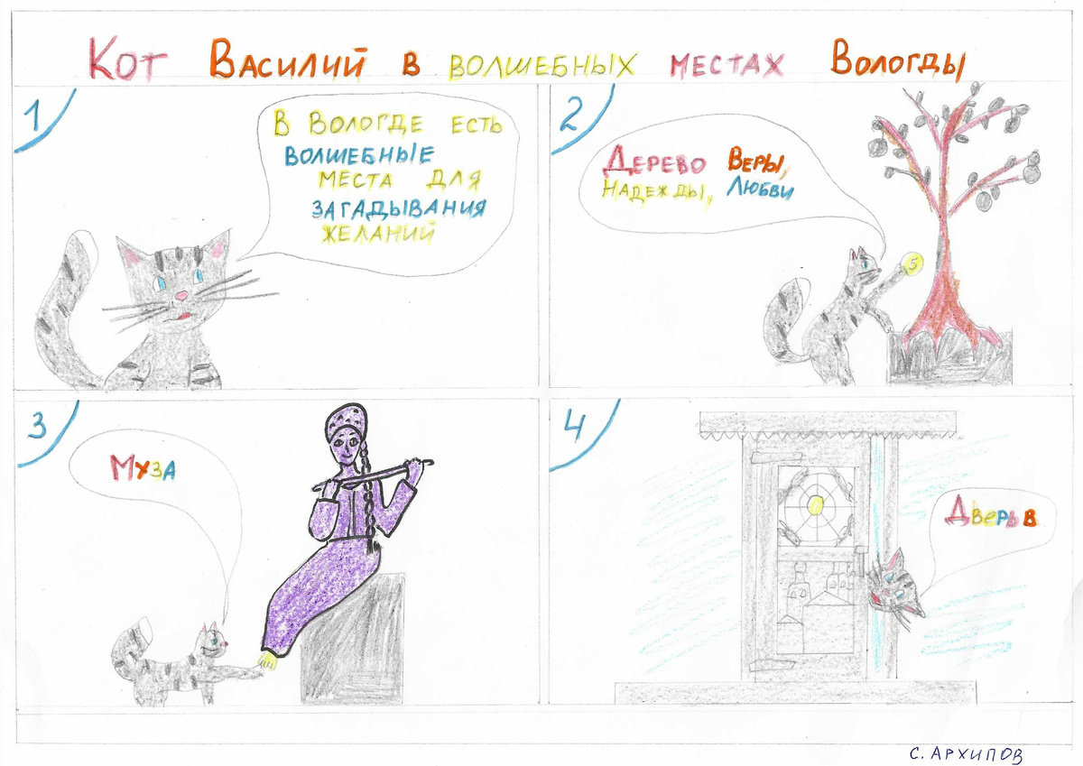 Межрегиональный конкурс творческих работ «Путешествие кота Василия по Вологодчине». Название: «Кот Василий в волшебных местах Вологды». Участник: Архипов Семен Сергеевич, обучающийся 3 "Г" класса МОУ "СОШ № 16", г. Вологда. Номинация: "Рисунок". Описание: Рисунок выполнен в жанре комикса в смешанной технике (карандаш, фломастеры, восковые мелки). Автор работы во время экскурсии узнал о «волшебных» местах в центре города Вологды, в которых можно загадать желание и оно обязательно сбудется. Это открытие и вдохновило на создание рисунка. На рисунке изображены три арт-объекта: «Дерево Веры, Надежды, Любви» (нужно загадать желание и поместить монетку в отверстие на стволе дерева), «Муза» (нужно загадать желание и потереть пальчики на ноге Музы), «Дверь в...» (нужно загадать желание, потереть изображение солнца в центре двери, постучать три раза ручкой и пройти через дверь). #Тендряковка #ЦентрТендрякова #ЮЦ #КотВасилий