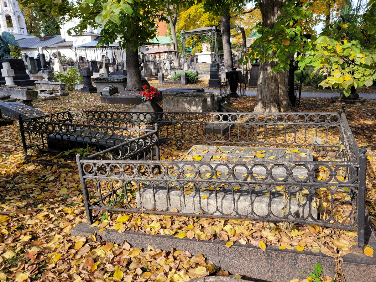 4 участок На переднем плане - захоронение Аксаковых, за ним с цветами - Орловы. Александр Николаевич Аксаков (1832-1903) — писатель, приверженец спиритизма, племянник С.Т. Аксакова. Произведения: «О народном пьянстве» (1872), «Спиритуализм и наука» (1872), Позитивизм в области спиритуализма» (1884) и др. Надпись: