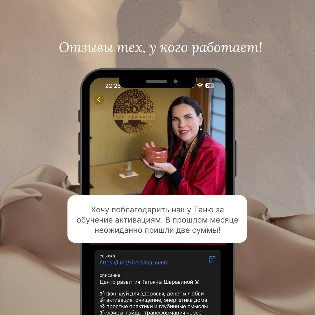 📣 «Неожиданно пришли две суммы... я и не помнила о залоге!» Иногда мы думаем, что для роста дохода нужно больше работать. А порой нужно просто... убрать невидимые пробки в своём пространстве, и тогда деньги начинают возвращаться к тебе из самых неожиданных источников. Это не теория. Вот магия в действии — отзыв моей ученицы после обучения активациям: «Девочки, хочу поблагодарить нашу Таню... за обучение активациям. В прошлом месяце неожиданно пришли две суммы... от брата... Позвонила ему и тот, на удивление, спокойно согласился. А вторая сумма пришла так. Позвонили и сказали, что у нас ваш залог лежит... Кредит закрыт в 2020. А я блин и не помню о залоге. В общем мои денежки ко мне вернулись» Что здесь произошло? ✔️ через активации создала в своём поле и пространстве воронку для возврата своих же денег и ресурсов. ✔️ убрала блоки, которые мешали ей получить то, что по праву принадлежит ей. Вселенная просто нашла самые быстрые пути, чтобы вернуть ей долги. 🎯 Хочешь так же? —