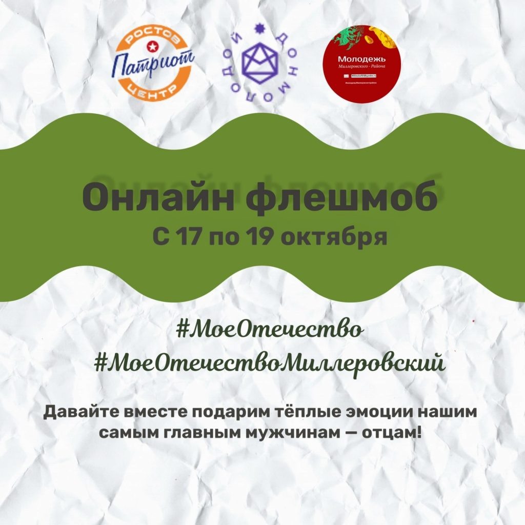 Давайте вместе подарим тёплые эмоции нашим самым главным мужчинам — отцам! С 17 по 19 октября стартует онлайн-флешмоб #МоеОтчество — трогательная акция, где каждый сможет сказать своему папе слова любви и благодарности. Как принять участие: Пусть интернет наполнится историями о тех, кто всегда рядом, кто научил нас быть сильными, добрыми и настоящими. Присоединяйся к флешмобу и расскажи миру о своём отце — ведь каждое “отчество” начинается с гордости за него! Оксана Шаповалова, Главный специалист по молодежной политике Миллеровского района