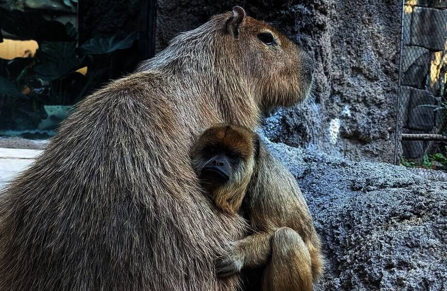Эта парочка покорила сердца посетителей. Мы уже писали, что капибары ― самые дружелюбные животные, и сегодня мы хотим рассказать еще одну историю об этих чудесных зверюшках. Капибара Ребекка живет в зоопарке американского города Денвер, и она подружилась с обезьяной по кличке Байя. В вольере, посвященном тропикам, эти животные стали единственными представительницами женского пола. Возможно, именно это обстоятельство изначально сблизило двух столь непохожих созданий. Природа наградила обоих животных социальным характером ― и капибары, и обезьяны-ревуны в естественных условиях живут группами, где общение играет ключевую роль в выживании. Оказавшись вместе в неволе, Ребекка и Байя нашли друг в друге то, чего им не хватало: поддержку, утешение и постоянное присутствие близкого существа. Чудесный пример женской дружбы, согласитесь? Конечно, фотографии подружек моментально разлетелись по соцсетям и стали вирусными. Вот тут у нас собрано больше примеров межвидовой дружбы.