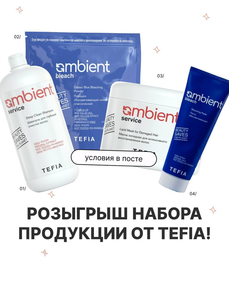 Розыгрыш октября. Обновленная паста — по-новому 💜 Все говорят об обновлении Ambient Bleaching Paste — теперь в новом формате и ещё удобнее в работе. В новой пасте все профессиональные свойства сохранились, но пользоваться стало проще и лучше. Вы ежедневно отмечаете нас в десятках потрясающих работ, делитесь формулами и вдохновляете своим профессионализмом. Мы не можем оставить это без внимания. Разыгрываем набор продукции для работы! Что внутри набора: 💎 Шампунь для глубокой очистки Ambient. 💎 Порошок обесцвечивающий синий классический. 💎 Маска липидная для интенсивного восстановления волос. 💎 Ambient Bleaching Paste в новом формате. Как участвовать: 1. Быть подписанным на @tefiapro 2. Рассказать в комментариях о своей самой запоминающейся работе c Ambient Bleaching Paste, в новом или предыдущем формате пасты (фото можно прикрепить по желанию). 3. Поставить лайк этой публикации. 📅 7 ноября мы выберем 1 победителя! Будем ждать ваши истории!