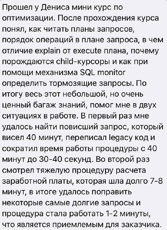 🔥 После мини-курса по оптимизации Oracle SQL всё изменилось: тот же запрос стал выполняться за 4 минуты вместо 40, коллеги начали приходить к нему за советом, а руководитель — считать с ним.