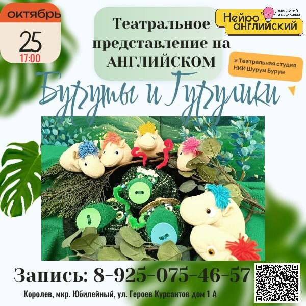 💙🧡💙Студия НЕЙРО-АНГЛИЙСКИЙ приглашает детей на театральное представление на АНГЛИЙСКОМ ЯЗЫКЕ Ваш ребенок : 🌿Посмотрит уникальный спектакль на английском 🌿Выучит много слов 🌿Влюбится в английский 🌿Получит подарочные сертификаты Для детей 6-12 лет 🕰 Когда: 25 октября, суббота, 17:00 Продолжительность 60 минут 🇬🇧 Студия Нейро Английский 📽Театральная Студия НИИ Шурум Бурум 🗺 Где: Королев, мкр. Юбилейный, ул. Героев Курсантов дом 1 А 🎫Для брони напишите ➕ в комментариях или сюда 👉https://t.me/Annie_teacher или сюда в ЛС (Whatsapp) РЕГИСТРАЦИЯ доступна по ссылке Стоимость: 1500 до 22 октября, 2000 после ❗️Торопитесь, мест мало❗️