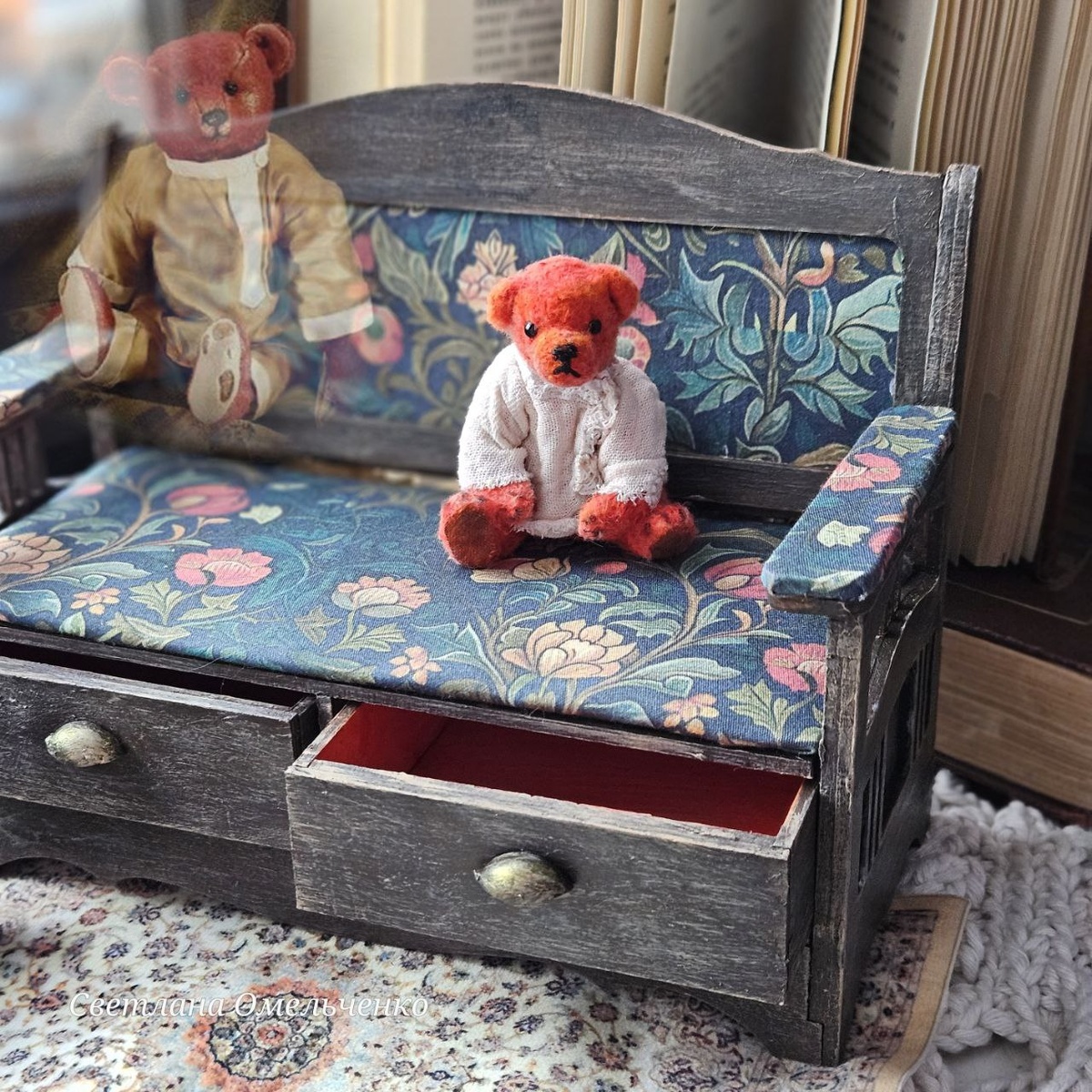Вязаная миниатюра по мотивам известных тедди. Знаменитый мишка Альфонсо . Для тех кто не знаком- история его ниже. История красного мишки Альфонсо Один из самых знаменитых тедди в мире – медвежонок Альфонсо. Сшитый из красного мохера 33-сантиметровый мишка немецкой фирмы Штайф (Steiff) был подарен Великим князем Георгием Михайловичем Романовым своей пятилетней дочери княжне Ксении в 1908 году. Тогда цветные мишки только входили в моду. Княжна назвала его Альфонсо, а ее няня сшила медвежонку русский костюм с рубашкой-косовороткой. В 1914 году княжна уехала в Англию к матери, кузине принца Георга V, и взяла с собой медвежонка. Начавшаяся I Мировая война и последующая за ней революция 1917 г. помешали ей вернуться в Россию, тем самым сохранив княжне жизнь. Царь Николай II с семьей в июле 1918 г. были расстреляны в Екатеринбурге, а отец Ксении расстрелян в 1919 г. Ксения до конца жизни берегла своего красного медвежонка.