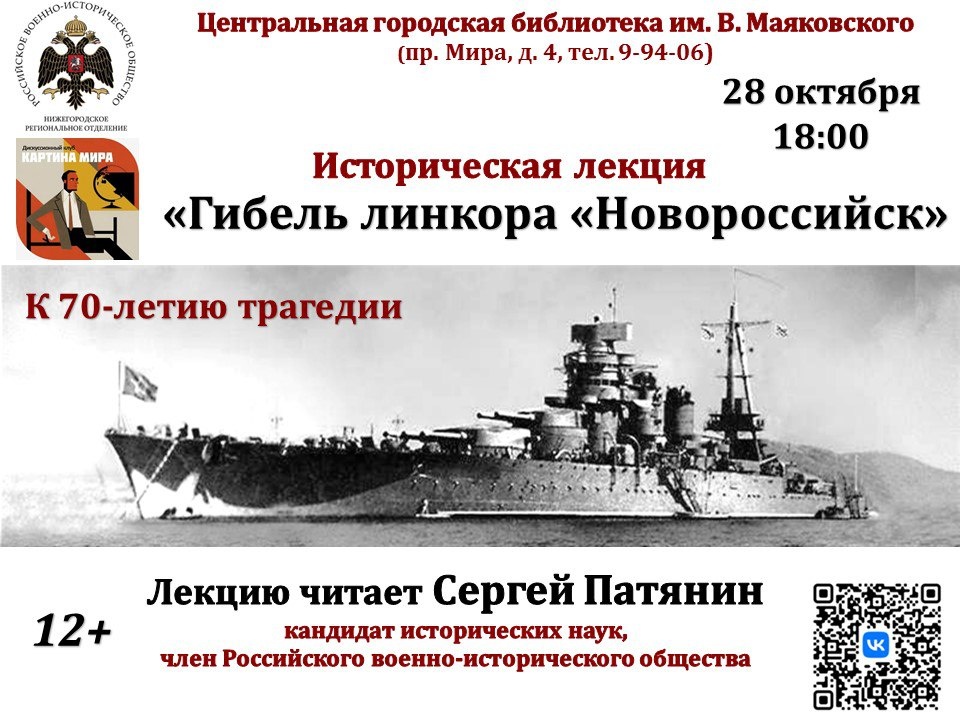 28 октября в 18:00 состоится историческая лекция Сергея Патянина «Гибель линкора «Новороссийск»: к 70-летию трагедии».
