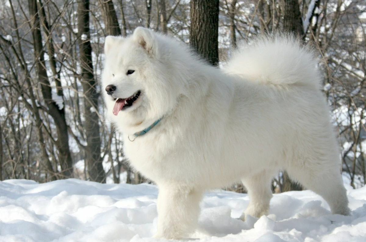 Внешность: Самоед — это воплощение зимней сказки. Его роскошная, ослепительно-белая шерсть с густым подшерстком и более длинным остевым волосом создает образ «полярного мишки». Но главная особенность — знаменитая «самоедская улыбка». Приподнятые уголки рта и темные, выразительные глаза-пуговки придают морде невероятно доброе и очаровательное выражение. Эта улыбка обусловлена анатомией и помогает собаке избегать слюнотечения при обильной линьке. Поза самомуда — гордая и благородная, с высоко поднятой головой и хвостом, лежащим на спине.