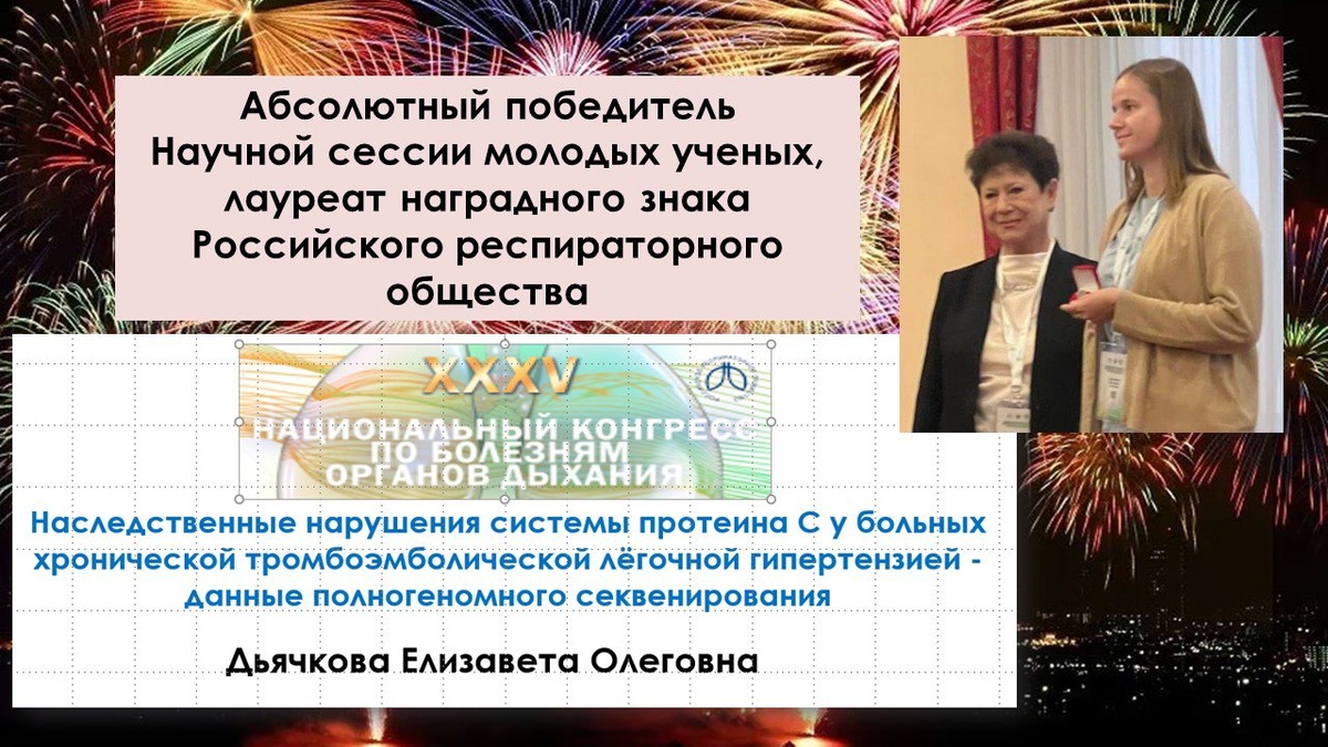 Елизавета Дьячкова стала по праву абсолютным победителем конкурса молодых ученых, который прошел на 35-м Национальном конгрессе по болезням органов дыхания. Поздравляем!