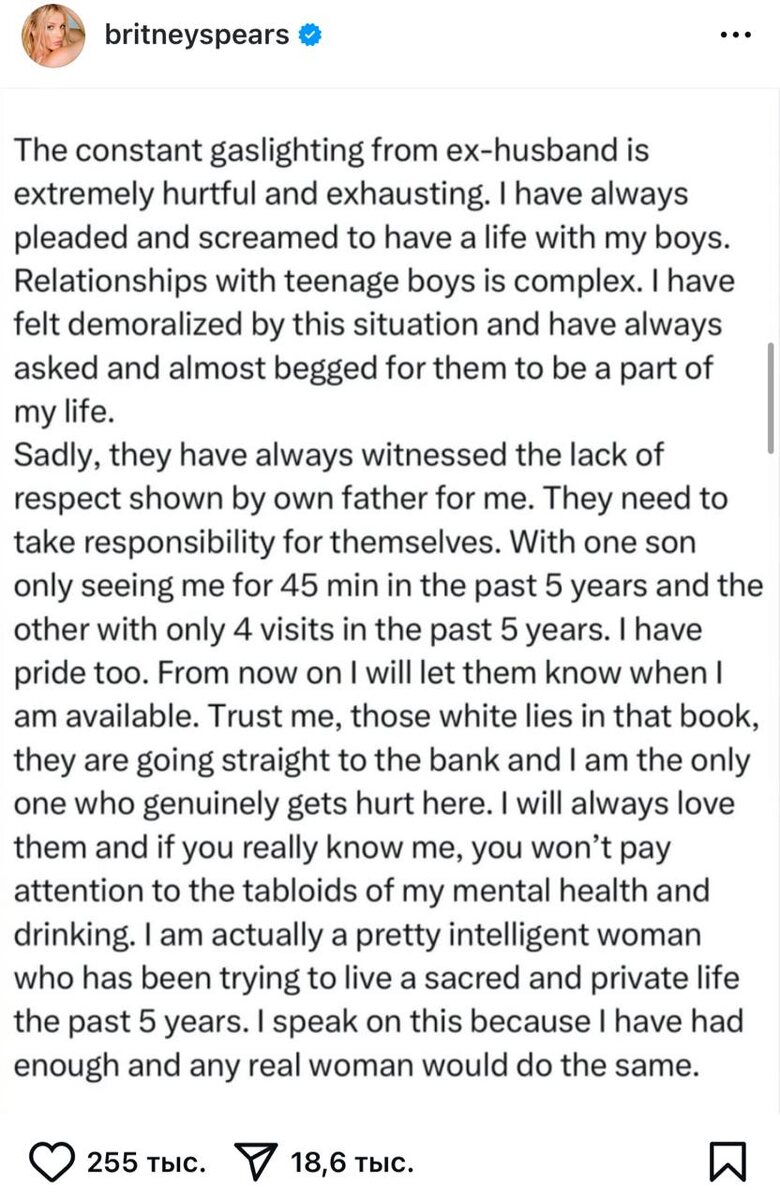 Бритни Спирс не выдержала нападок СМИ по поводу мемуаров ее бывшего мужа Кевина Федерлайна, о которых мы писали тут, и выдала по-настоящему душещипательное заявление в запрещенной сети. «Постоянный газлайтинг со стороны моего бывшего мужа причиняет мне боль. Я всегда стремилась жить со своими детьми. Отношения с мальчиками-подростками сложны. Меня всегда угнетала эта ситуация, и я постоянно просила и даже умоляла их быть частью моей жизни. К сожалению, они всегда видели неуважение ко мне со стороны их отца. Им нужно взять ответственность за свою жизнь на себя. Один из сыновей виделся со мной 45 минут за последние пять лет, а другой приезжал всего четыре раза. У меня тоже есть самоуважение. Отныне я сама буду давать им знать, когда готова их видеть. Поверьте, ложь в этой книге - только ради наживы. Я единственная, кто от этого страдает. Я всегда буду любить их, и если вы действительно знаете меня, то не будете обращать внимание на новости о моём ментальном здоровье и алкоголизме. На