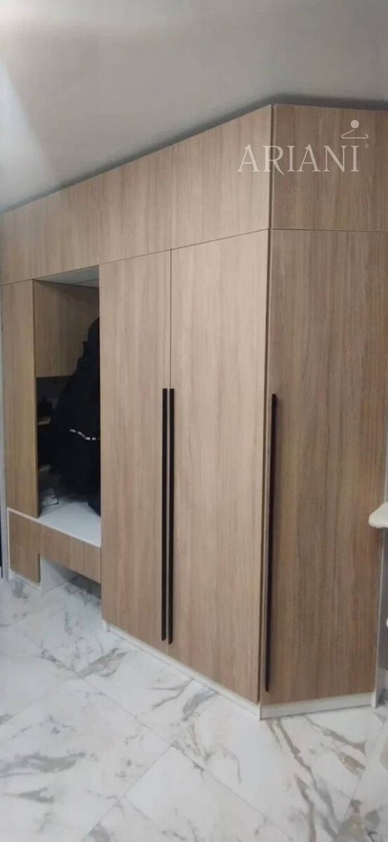 В новом проекте Ariani мы превращаем прихожую в пространство, где порядок и стиль идут рука об руку. Встроенный шкаф-купе из светлого дерева с чёрными ручками не только выглядит современно, но и умело решает все задачи хранения.