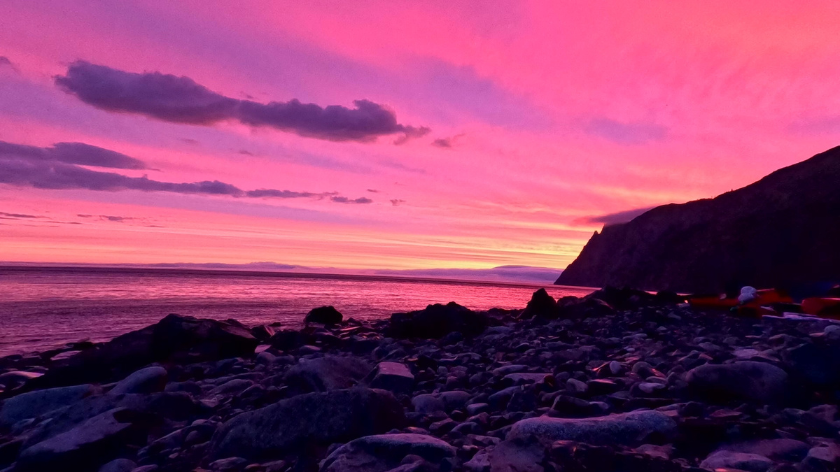 Впервые за четыре дня путешествия я был ТАААААК рад быть на берегу (выйти из этого сурового моря). Но мысли быстро перешли на неразделанную рыбу. Мой уровень рыбака таков, что я не знал, самка это или самец. Для людей моего уровня уточню, что голова самки и самца горбуши сильно отличаются… И при разделке тушки меня обрадовала икра, которая начала убегать по одной икринке. Конечно, я убедил её остаться всю, кроме 10-15 икринок. Дальше — разжигание костра. Поставил изготовление углей в автоматический режим и пошёл раскладывать палатку. Нашёл два больших бревна, сдвинул их под углом в 90 градусов и привязал нижний тент палатки, а дальше поднял её с помощью дуг, заранее собранных и вдетых в специальные отверстия. В общем, палатка была максимально привязана со всех сторон, так как погода мне намекала, что ветрище будет ужасный. В ход шли тяжёлые камни и дополнительные верёвки. Угли поспели, местами ещё горел огонь, но он мне не мешал для приготовления горбуши в фольге. Также была приготовлена икра в морской воде с добавлением ещё соли. Метод придумал сам, наверное, неправильный, и всё же было вкусно.