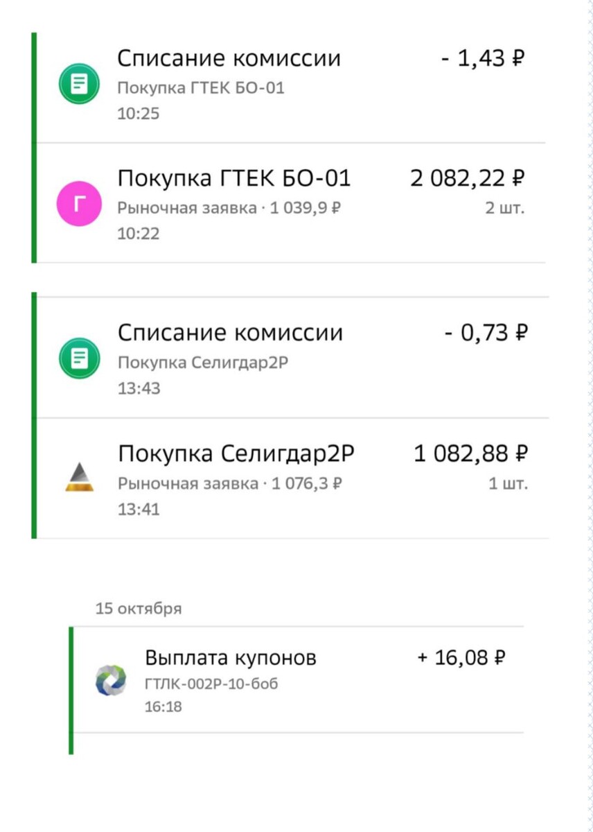 Покупки облигаций: Я подавала заявку на участие в первичном размещении, но там был бешеный спрос и мне не хватило, заявка отменилась. Купила на вторичном рынке, причём, за сутки цена вон как взлетела 😒 Гельтек-Медика - медико-косметологическая компания, производит медицинские гели (для УЗИ, для физиотерапии и тд), косметику для аппаратной косметологии и для дома. Кредитный рейтинг: ВВВ Купон: постоянный, 22%, выплаты каждый месяц, ближайшая 14 ноября Погашение: сентябрь 2028г Селигдар - холдинг, который занимается добычей золота и олова. Кредитный рейтинг: А+ Купон: постоянный, 24%, выплаты каждый месяц, ближайшая 6 ноября Погашение: март 2027 г ----------------- Итого у меня теперь всего 22 облигации (9,8% портфеля) *Не ИИР Ещё позавчера пришёл купон от ГТЛК +16,08 ------------ Дивы за 2024 / дивы и купоны за 2025 г: 25 968 р / 14 703 р