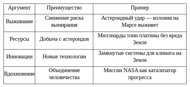 3. Научный и технологический прогресс Исследования в космосе уже революционизировали медицину (МРТ, телемедицина) и материалы. Колонизация ускорит открытия: от лечения рака до ИИ для автономных habitat'ов. NASA подчёркивает: это вдохновляет поколения, создаёт новые индустрии (космический туризм, добыча) и объединяет человечество. Роберт Зубрин аргументирует: только Марс имеет все ресурсы для полноценной цивилизации.