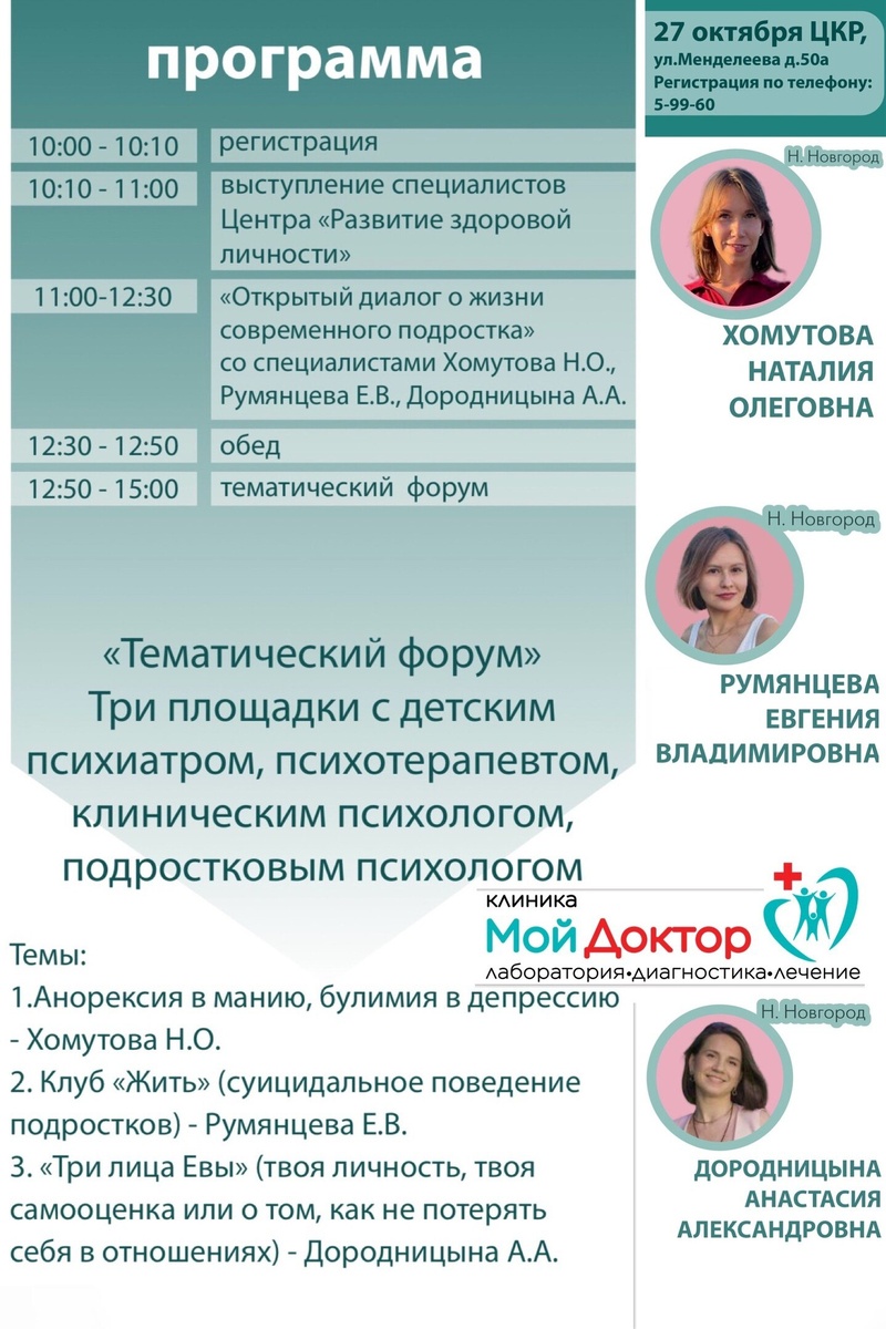 В Центре культурного развития пройдет встреча для родителей и педагогов «Мир глазами подростка» Участники встретятся с врачами и другими специалистами по работе с подростками и обсудят основные проблемы, связанные с пубертатным периодом. Встреча пройдет 27 октября в 10:00. Участие бесплатное. Количество мест ограничено. Обязательна регистрация по тел.: 5-99-60.