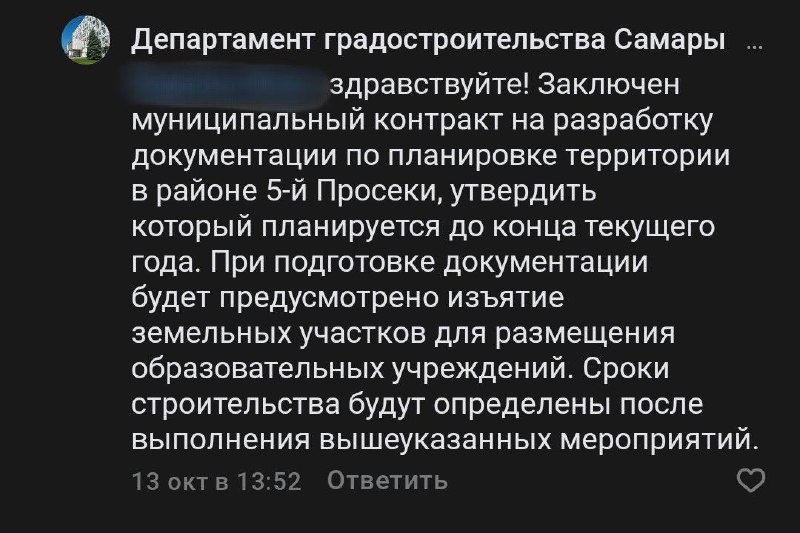 Согласно решению Ленинского суда Самары от 2022 года и апелляционному определению 2023-го администрация Самары должна была организовать строительство школы и детского сада на 5-й Просеке. Суд постановил разработать проектную документацию до 31 декабря 2023 года. Но администрация, вероятно, решила, что решения суда просто непросто необязательные рекомендации и поэтому торги на разработку документации провели лишь в июне 2025 года. Через полтора года после срока, установленного судом Департамент градостроительства в переписке с жителями сообщил: школу и детсад планируют построить до сентября 2029 года, а ввести в эксплуатацию к декабрю 2029 – январю 2030. То есть через 6–7 лет после судебного решения. Хотя губернатор обещал успеть к 2029 году На сегодняшний день в районе не хватает 1174 школьных и 412 дошкольных мест. Родители вынуждены возить детей через весь город, потому что местные власти годами «проектируют» воздух Тем временем прокуратура Самары отвечает, что «все меры приняты».