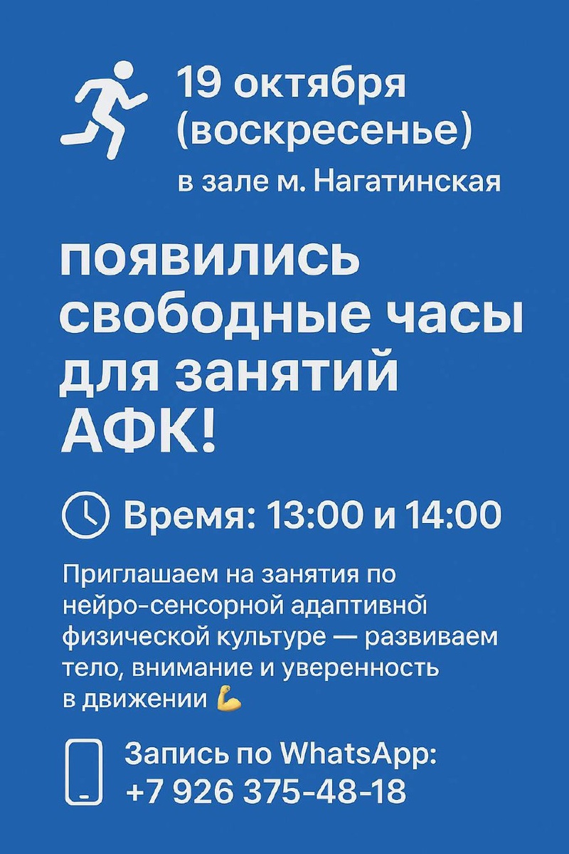🏃♂️ 19 октября (воскресенье) в зале м. Нагатинская появились свободные часы для занятий АФК! 🕐 Время: 13:00 и 14:00 Приглашаем на занятия по нейро-сенсорной адаптивной физической культуре — развиваем тело, внимание и уверенность в движении 💪 📲 Запись по WhatsApp: +7 926 375-48-18
