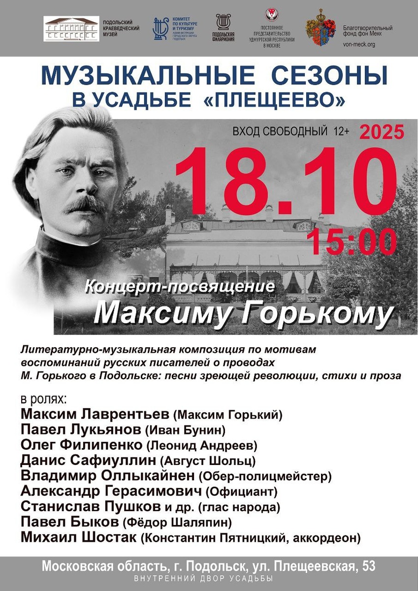 ✨ Концерт, посвящённый писателю Максиму Горькому 🎶В программе - литературно-музыкальные композиции по мотивам воспоминаний русских писателей о проводах М. Горького в Подольске: песни зреющей революции, стихи и проза. 🚫 Возраст: 12+ 📆 18.10.2025 🕒 15:00 🏢 Усадьба "Плещеево" 📍 г. Подольск, ул. Плещеевская, 53 💰 Вход свободный❗️ ⭐Поддержать канал голосом 💰 Вакансия - курьер в Подольске ✅ Мероприятия Подольск https://dzen.ru/id/66ed500f7b5671493eca3fd6 http://vk.com/podolsk_events http://dzen.ru/podolsk_events