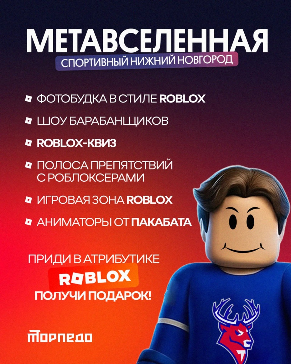 Сегодня «Нагорный» погружается в метавселенную Roblox! ⠀ Болельщиков ждет настоящий цифровой праздник: 📸 Фотобудка в стиле Roblox 🥁 Шоу барабанщиков BW Drum Show 🧩 Roblox-квиз на медиакубе 🎯 Полоса препятствий и игровая зона 🎭 Аниматоры от «ПАКАБАТА» ⠀ Приходи в атрибутике Roblox — получи подарок! 🎁 А самые активные на трибунах смогут выиграть призы от наших партнеров — SPAR, SYNERGETIC, «Додо Пиццы», Министерства спорта Нижегородской области, ЦУРС и «Нижний 800» 👏