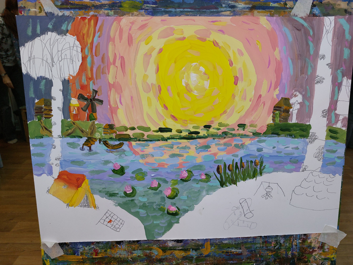 Октябрь 2025, Москва. Миша 15 лет. Аутизм, УУО. У меня закончилась фантазия для придумывания заголовков, так что я решила идти по самому легкому пути, называя свои статьи. Во вторник у Миши рисование. Для меня поездка на рисование - это двойная радость, т.к. на групповом занятии я вижусь со старыми знакомыми, мамами других подростков, с которыми я познакомилась еще работая няней в в 2020-2021 гг. Можно немного поболтать с ними. Естественно, каждая мама все равно больше всего занята своим ребеном, так что им особо не до общения. Тема последнего занятия "Разноцветное солнце на берегу реки". Евгения Сергеевна показала образец: "Вот, смотри, другой Миша нарисовал ивы". Наш Миша усмехнулся, и стал рисовать березы и ели. А потом как начал рисовать подробности-детали: палатку, коврик возле палатки, костер, дрова, камень, на противоположном берегу лодочная станция, деревня, мельница.... Особенно тщательно он вырисовывал цветы на воде. Пришлось его останавливать, а то он бы опять очередной