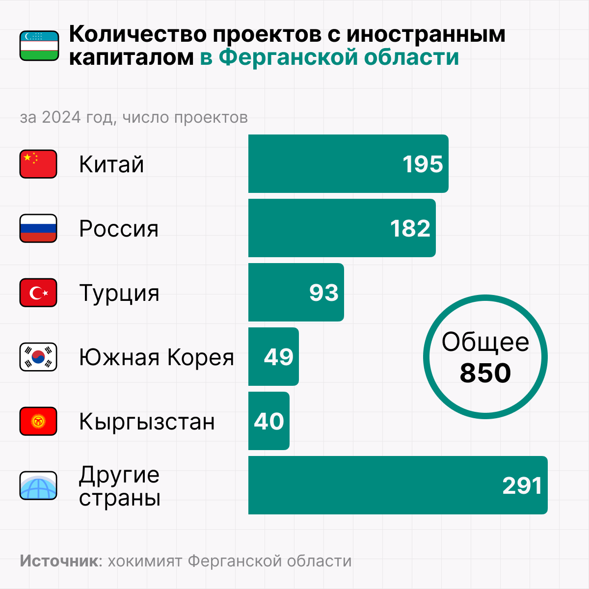 На долю РФ приходится 182 проекта с иностранным капиталом, тогда как Китай реализует 195, а Турция - 93 проекта.