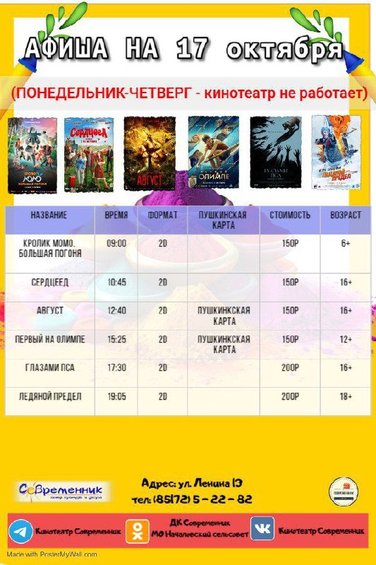 🍿ДК «Современник» в селе Началово предлагает к просмотру премьеры фильмов. Скорее смотри афишу и выбирай куда сходить уже сегодня!