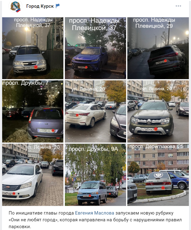 Сегодня, 17 октября, мэрия Курска запустила новую рубрику «Они не любят город», куда в еженедельном режиме планирует публиковать фотографии автомобилей, которые припаркованы на газонах и в других неподходящих для стоянки местах. Инициатива принадлежит градоначальнику Евгению Маслову – он предложил путём общественной огласки бороться небрежным отношением автомобилистов к городским пространствам.