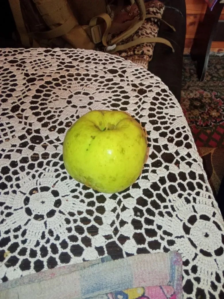 Здравствуйте, мне муж в эти выходные с дачи фотку яблока отправил. У нас молодая яблоня, вот первый урожай)). Он гордится, сам выбирал деревце, сам сажал, сам растил, сам переживал, что до урожая надо еще дожить и я понимаю эту радость, хотя я больше по комнатным растениям, но когда ждешь цветения и вот это чудо случилось, то нарадоваться потом не можешь. И ничего оно не маленькое, размером с неплохой мужской кулак, но жесткое. Кстати, я любила крючком вязать, теперь все скатерти на дачу переехали, в квартире уже и не смотрятся. А на даче в комплекте с коврами очень неплохо)). Продолжу обзор из секонда, цена 990 за кг. Платье цвета фуксии, оно намного расширяется к низу, но хотелось бы посвободнее. Тонкая вискоза. Пальто понравилось). Немного приталенная модель, лёгкое и без утеплителя. Нет состава, но на руку кусачее, возможно шерсть там есть. Было бы оно другого цвета и размера. Мне оранжевое у лица просто противопоказано и М-ка мне велика. Светло-серая кофта на молнии, высокий