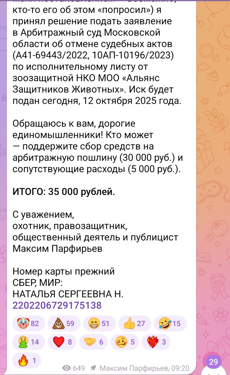 Любят, ой, как любят "оппоненты зоозащиты" ругать защитников животных за то, что они просят помочь деньгами на содержание и лечение животных. На сирых да убогих просят. Пойдите в фонд омс и потребуйте, чтобы ваши деньги только на вас и тратились, а не на неработающих граждан, на лиц, чьи взносы гамного меньше расходов. Тоже ваа копеечка расходуется. Или чтобы к концу года неизрасходованные на вас денежные средства вам в кармашек обратно клали. А то, ишь! тырят мелочь по карманам. Какие плохие. Но нет. Там мы промолчим, ибо механизма финансирования и распределения средств не знаем. А зоозащиту грязью поливаем, потому, что не знаем нравственных законов. Ничего знать не знаем, но в интернетах шумим, вместо того, чтобы книжки вумные почитать. В ряду интернет попрошаек прибыло! И вы, нетоварищи нам, не любители животных, вполне можете подключится и направить еще и туда праведный гнев. Итак, не буду томить. Макс Парфирьев. О, как. Прошу, грит, внимания. Али поддержки. А можно и того, и д