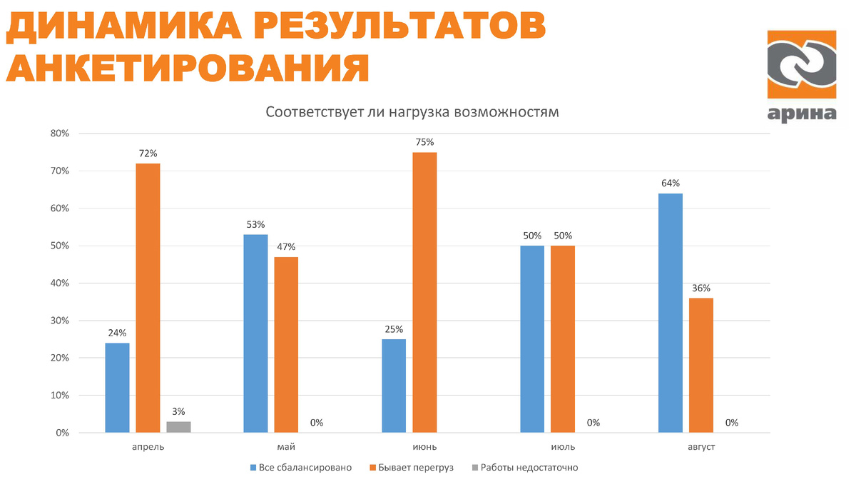 В ИКЦ "Арина" каждый месяц проходят опросы вовлеченности. Сотрудники заполняют анкеты - добровольно и анонимно. Ответы используются для подведения общего итога. Опросы помогают выявить процент удовлетворенности, вовремя заметить проблемные места и принять необходимые меры. Об этом подробнее рассказала руководитель Татьяна Федорова в комментарии для статьи, которую опубликовал портал "Риск-менеджмент. Практика": "Выгорание связано не только с нагрузкой, а с отсутствием выхода у напряжения. По нашим данным, общий уровень вовлеченности сотрудников компании высокий — 96%, мотивация — 86%, лояльность — 92%. Но даже при таких цифрах мы видим зоны риска. В августе зафиксирован спад удовлетворенности: часть сотрудников жаловалась на перегрузку и неясность карьерного роста. Это типичные триггеры выгорания — разрыв между ожиданиями и реальностью, отсутствие перспектив и непрозрачные правила. В нашем центре из 40 человек уже треть демонстрирует признаки «выключения»: сотрудники не делают предл