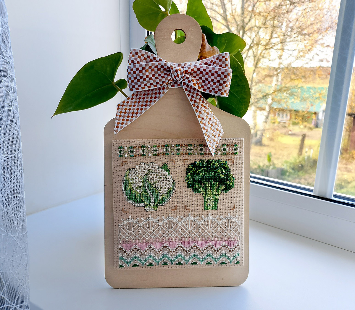 В десятом выпуске журнала «Время вышивать!», посвящённом кухонному прикладному оформлению, опубликовали схему Светланы Яковлевой «Полезные споры». На схеме изображены цветная капуста и брокколи в сопровождении ажурных узоров. Оформили вышивку своеобразно: натянутую на картон работу прикрепили на разделочную доску, а ручку украсили двойным бантом.
