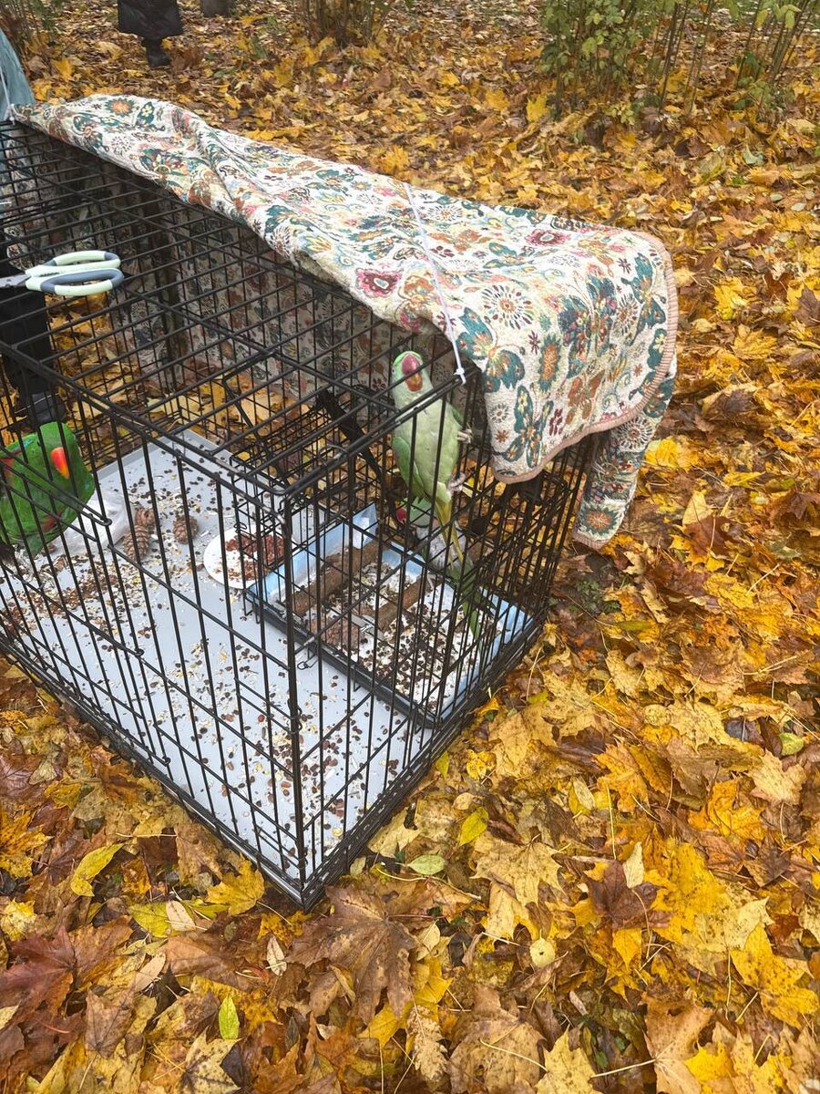 Рабочая группа сработала отлично. Первый у нас. Справились быстро, птица заинтересовалась уже на том этапе как мы собирали клетки и спустилась очень быстро. Пока птица едет к нам. Покажем врачу, посмотрим как там дела, дальше будем разбираться. Предположительно птица останется с нами и как раз составит компанию нашему Гринфилду. Поймать ожерелового попугая пока не смогли.