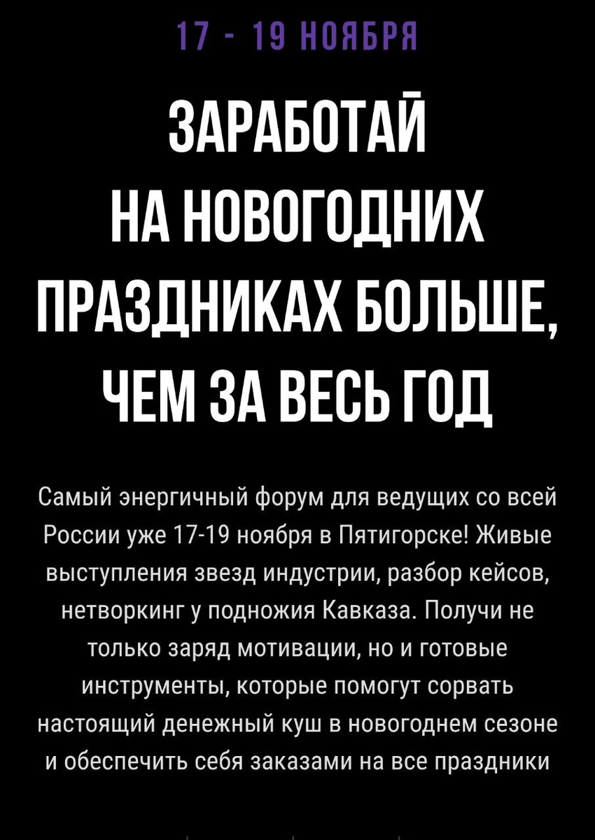 🗣Заработай на новогодних праздниках больше, чем за весь год🗣 #17ноября2025 #18ноября2025 #19ноября2025 #Пятигорск #офлайн ⏰ 10:30 📍 Парк родник Сид Холл, ул. Фабричная, 1 💰 Стоимость от 21.000 руб до 55.000 руб ❗️ Регистрация Самый энергичный форум для ведущих со всей России уже 17-19 ноября в Пятигорске! Живые выступления звезд индустрии, разбор кейсов, нетворкинг у подножия Кавказа. Получи не только заряд мотивации, но и готовые инструменты, которые помогут сорвать настоящий денежный куш в новогоднем сезоне и обеспечить себя заказами на все праздники За 8 лет мы выросли в настоящее международное комьюнити, и вот что нас отличает 1000+ участников, которые изменили свой подход к ведению мероприятий 43 наставника, которые погрузили участников в свои лучшие авторские методики 38 городов создали мощную энергетическую волну, меняя индустрию праздников Наши спикеры: эксперты, которые меняют правила игры Мы собрали топовых специалистов индустрии, чей опыт говорит сам за себя. Кажд