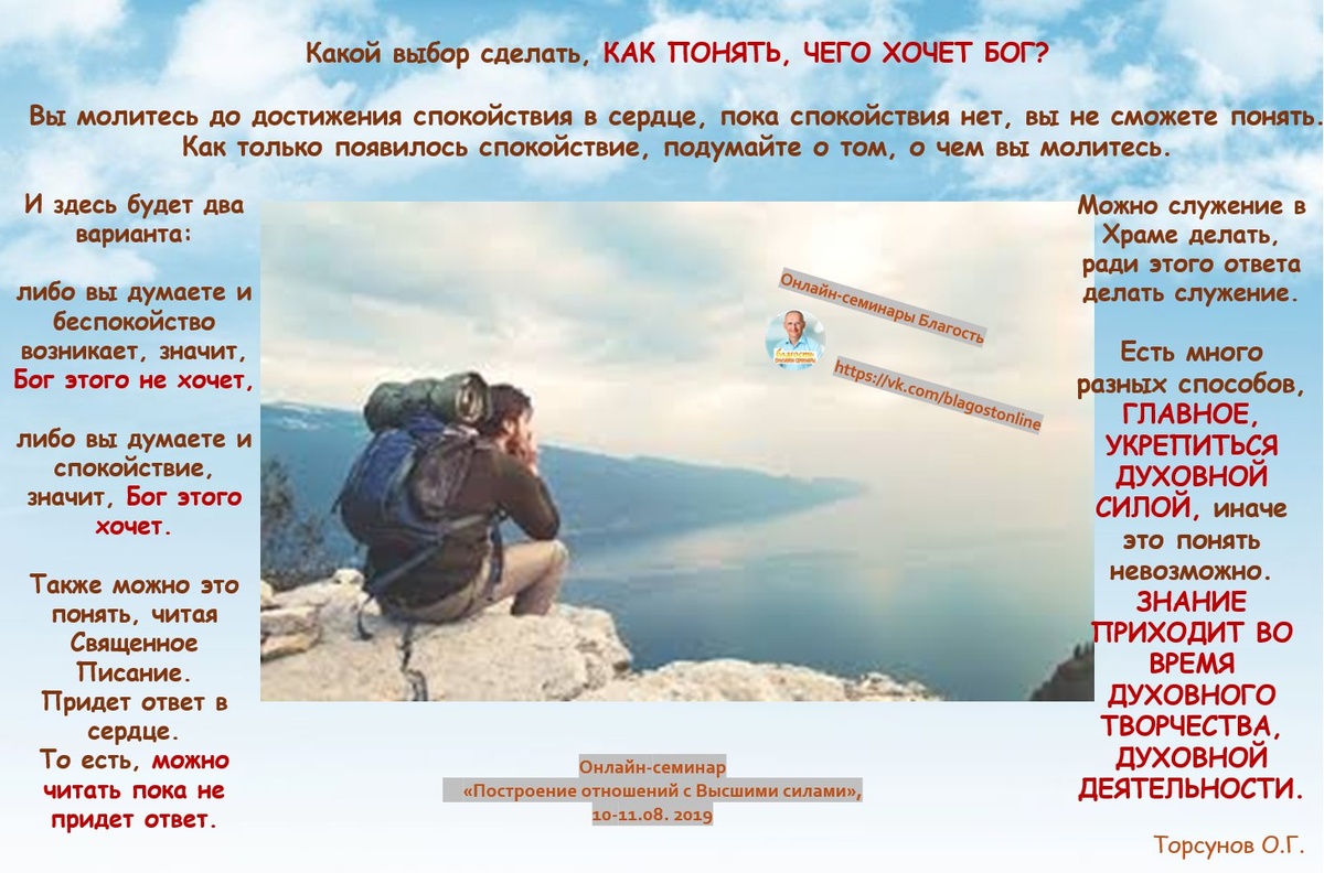 Какой выбор сделать, КАК ПОНЯТЬ, ЧЕГО ХОЧЕТ БОГ? Вы молитесь до достижения спокойствия в сердце, пока спокойствия нет, вы не сможете понять. Как только появилось спокойствие, подумайте о том, о чем вы молитесь. И здесь будет два варианта: либо вы думаете и беспокойство возникает, значит, Бог этого не хочет, либо вы думаете и спокойствие, значит, Бог этого хочет. Также можно это понять, читая Священное Писание. Придет ответ в сердце. То есть, можно читать пока не придет ответ. Можно служение в Храме делать, ради этого ответа делать служение. Есть много разных способов, ГЛАВНОЕ, УКРЕПИТЬСЯ ДУХОВНОЙ СИЛОЙ, иначе это понять невозможно. ЗНАНИЕ ПРИХОДИТ ВО ВРЕМЯ ДУХОВНОГО ТВОРЧЕСТВА, ДУХОВНОЙ ДЕЯТЕЛЬНОСТИ.