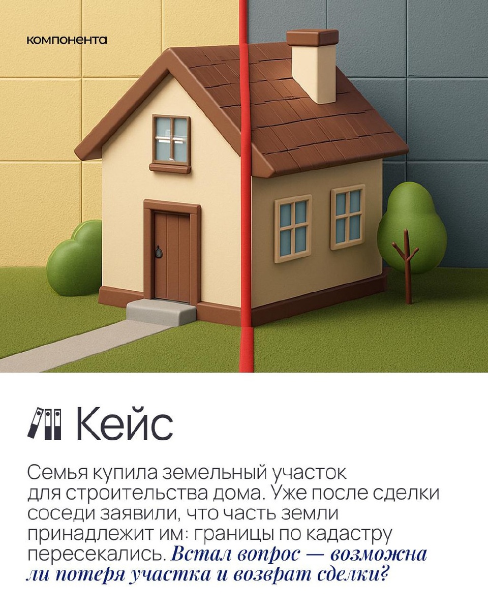 Вы купили участок, а потом выяснилось, что его границы пересекаются с землёй соседа? К сожалению, такие ситуации — не редкость. Ошибки в кадастровом учёте и недобросовестные соседи могут поставить под угрозу право собственности и даже строительство дома. ❌ Многие в панике думают о возврате сделки или смиряются с потерей части земли. Но это не единственный выход. В одном из наших кейсов мы доказали ошибку кадастрового учёта и сохранили участок за семьёй клиента полностью. Главное — действовать быстро: провести экспертизу, собрать документы и правильно выстроить защиту. ✅ Юристы бюро Компонента знают, как решать земельные споры и защищать права собственников. Запишитесь на бесплатную консультация по ссылке