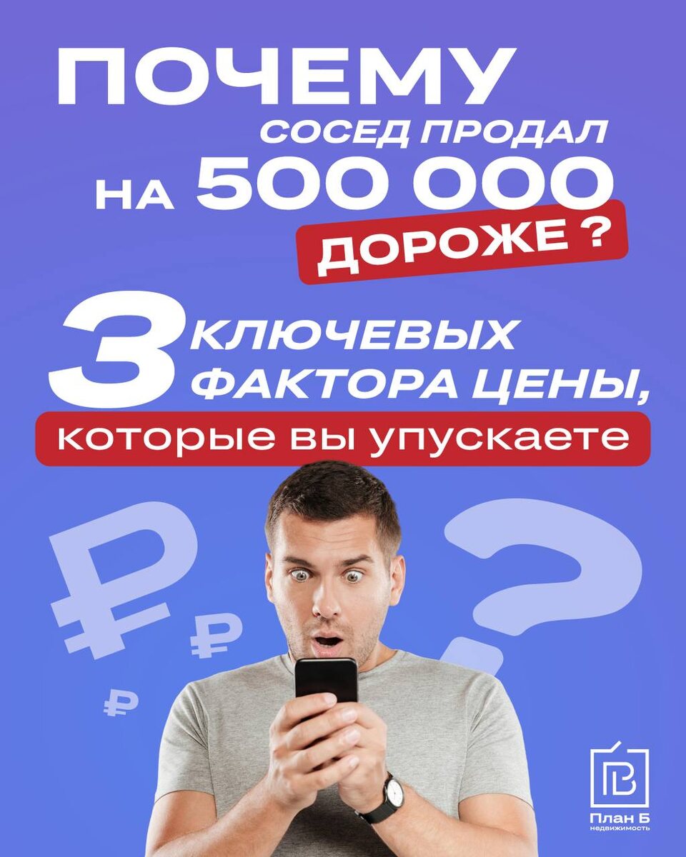 😳 Почему сосед продал на 500 тыс. дороже? Разбираем 3 ключевых фактора цены, которые вы упускаете⬇️ 🏷 Решили продавать квартиру, выложили объявление на Avito и ждете звонков. А через месяц узнаете, что сосед с такой же квартирой только что оформил сделку — и его итоговая цена на полмиллиона рублей выше вашей💸 🤷♂️«Повезло», — думаете вы. А мы, как специалисты с опытом, скажем вам: это не везение. Это система. Пока вы ждете, ваш сосед и его профессионал-агент работали. И секрет не в магии, а в трех конкретных факторах, которые большинство продавцов игнорируют (или не знают). 1️⃣Фактор №1: Не цена, а упаковка Вы считаете, что главное — указать низкую цену, чтобы привлечь внимание? Это ловушка. Покупатель покупает не квадратные метры. Зачастую, он покупает ощущение дома, решение своей проблемы и эмоцию. Ваш сосед продал дороже, потому что его квартира была правильно «упакована». Мы - эксперты, и знаем, как это сделать. 2️⃣Фактор №2: Не «скинуть цену», а управлять ею Вы выстав