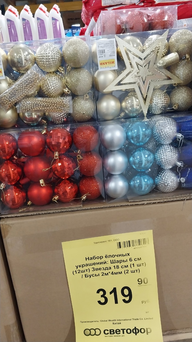 Приветствую вас, мои дорогие друзья и подписчики. Зашла в Светофор, а там уже новогоднее настроение. Магазин находится по адресу Ростовская область, Зерноградский район, город Зерноград, улица Садовая, 9 А Набор ёлочных украшений: Шары 6 см 12 штук, Звезда 18 см 1 шт., / Бусы 2 метра 4 мм 2 шт цена 319.90 рублей. Новогодняя Ёлка искусственная RSV 150 см, 300 веточек цена 1111.90 рублей. Страна Китай. Пневмохлопушка Новогодняя от 40 см диаметр 5 см, дизайн в ассортименте цена 79.90 рублей. Страна Китай. Гирлянда проволока 10 м. 100 LED ламп 8 режимов, USB / 220 В цена 165.90 рублей. Страна Китай. Декоративная фигурка под ёлку 40 см в ассортименте (олень, снеговик, дед мороз ) цена 569.90 рублей . Наклейки новогодние с раскраской , размер 30 *40 см , в ассортименте цена 71.90 рублей . Уличное светодиодное украшение 4×0.7 м, морозостойкое, 72 LED ламп, 220 В, защита от мороза цена 381.90 рублей. Страна Китай. Гирлянда с насадками "Метеоритный дождь " 8 штук,