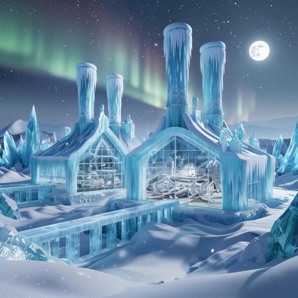 Что, если бы заводы строили не из бетона, а из чистейшего льда? Мы попросили нейросеть пофантазировать на эту тему, и результат превзошёл все ожидания. Перед нами выросли настоящие ледяные дворцы, полные морозной мощи и хрустальной геометрии. Взгляните на эту уникальную эстетику, где индустрия встречается со стихией!