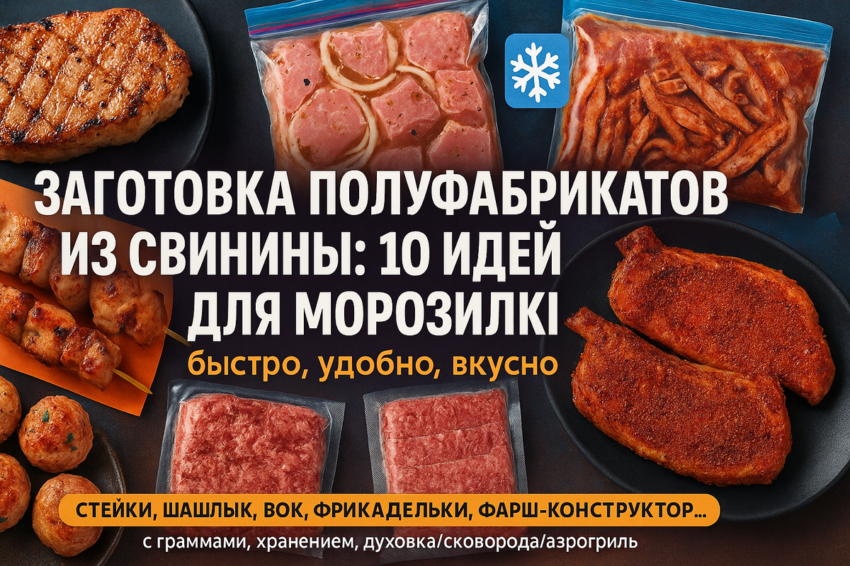 Нежные шницели в «сухой панировке», стейки шеи на сухом рассоле, шашлык «лук-минералка» прямо из морозилки, азиатские полоски для вок, сочные фрикадельки и универсальный фарш-конструктор. Все заготовки — проверенные временем, с точными граммами, понятной упаковкой, сроками хранения и способами приготовления в духовке, на сковороде и в аэрогриле. Жмите — и забирайте 10 рабочих полуфабрикатов из свинины! 🧊🍖✨