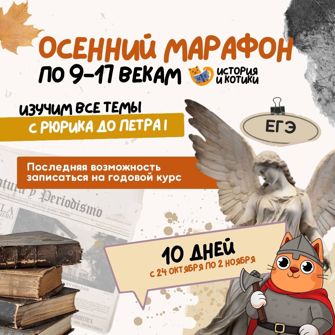 🍂 Старт записи на осенний марафон по 9-17 вв.! Марафон поможет: — пройти всю теорию этого периода (1/3 истории России) — систематизировать и отработать знания на практике — войти в учебный ритм — уверенно двигаться дальше без пробелов 👉 даты обучения — с 24 октября по 2 ноября 👉 цена обучения — всего 2490р. 👉 формат обучения — авторская, новая, удобная платформа стадикэтс с уроками, материалами, тестами и второй частью с проверкой от куратора