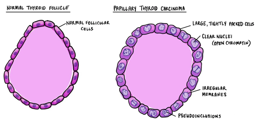 Характерным признаком ПР ЩЖ является строение ядра: они выглядят как притертые часовые стекла из-за отчетливых контуров ядерной мембраны и распыления хроматина, вследствие чего наблюдается прозрачность внутреннего ядерного содержимого. Ядро смещено к ядерной оболочке и приобретает вид солитарного базофильного ядра. Из-за глубоких бороздок, возникающих вследствие складок в ядерной мембране, ядра могут приобретать вид «осколков толченого стекла». Специфические изменения ядер клеток ПР в зарубежной литературе описывают как «глазки Сиротки Энни».