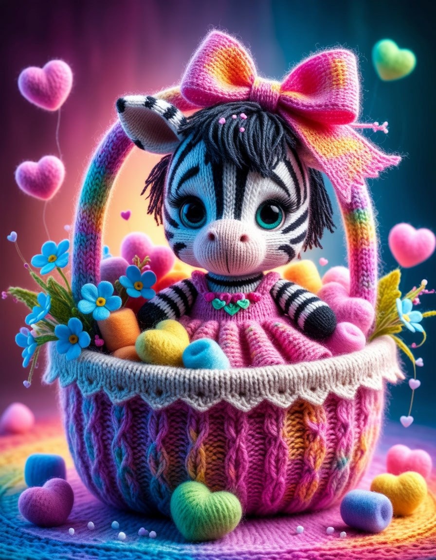 Вязаная мультяшная зебра с корзиной цветов. Нейросеть: Шедеврум Про. #цифроваяживопись #нейросеть #нейроарт #артыотнейросетей #цифровоефото #идеи #рисунок #нейрофото #aiartwork #нейроSD #DigitalDreamscapes #шедеврум #арт #ai #иллюстрация #digitalart #бесплатныйарт #зебра #вязание #цветы