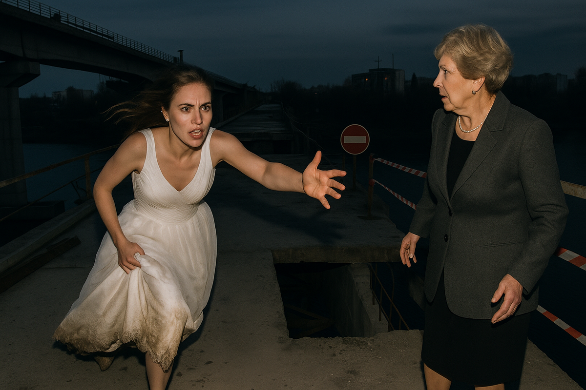Не раздумывая, Наташа подхватила подол свадебного платья и бросилась на мост.