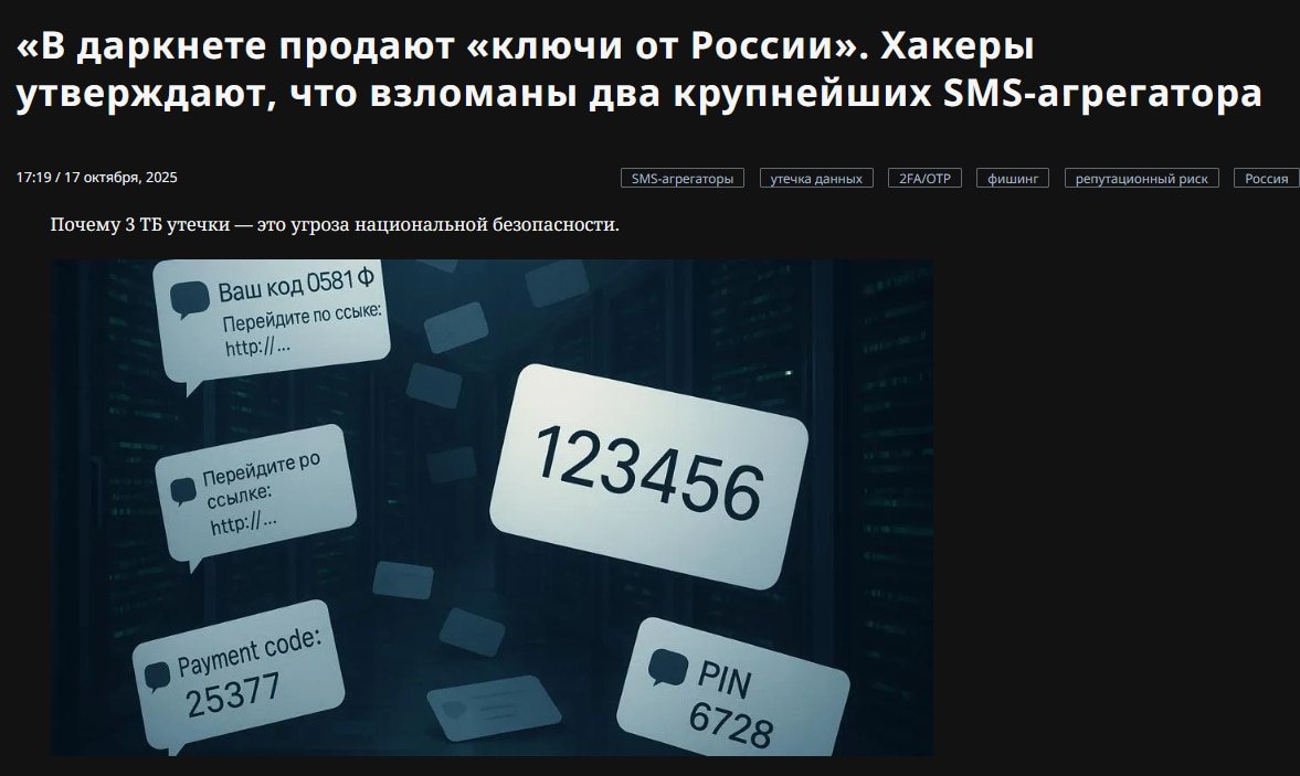 ⚡️ В даркнете ПРОДАЛИ «ключи от России». Хакеры заявляют, что взломали два крупных SMS-сервиса и слили три терабайта данных: имена, номера, IP-адреса, банковские сообщения, коды активации и прочее. Что это даёт злоумышленникам: ⚡️Перехватывать SMS-коды и брать под контроль почту, соцсети и криптокошельки; ⚡️Захватывать аккаунты и менять пароли; ⚡️Рассылать фишинг от имени банков и госструктур с их же официальных номеров. Пока ни один из сервисов утечку не подтвердил. Надеемся, это фейк. Готовы менять номера и закрывать всё по максимуму? CtrlAltDelights- подписаться