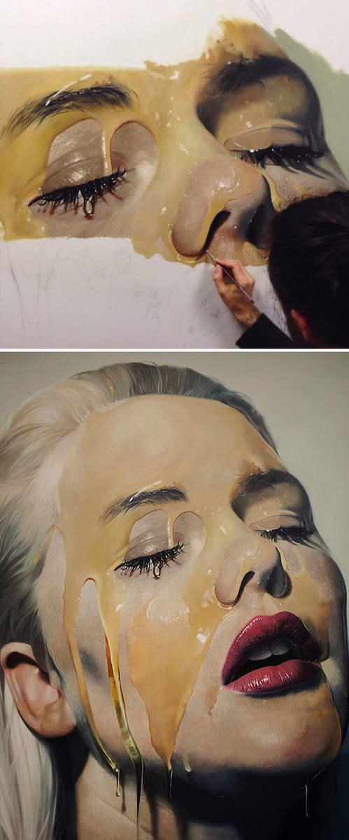 Представьте, что вы — Золушка на балу. Всё прекрасно: платье, музыка, блеск в глазах. Но вот пробивает полночь, и с вашего лица начинает стекать что-то липкое, золотистое и странно красивое. Не кровь, не слёзы, а густой, тягучий мёд. Примерно такое ощущение — одновременно шокирующее и завораживающее — возникает при взгляде на работы немецкого художника Майка Даргаса. Это не просто гиперреализм. Это — гиперреализм с привкусом. С привкусом мёда, сиропа и горькой правды о нашем мире. Даргас — это тот редкий тип творца, который начинал с тротуарной живописи в 11 лет, прошёл путь через тату-салоны и скульптуру, чтобы в итоге прийти к холсту и начать творить самое шокирующее и обаятельное, что случалось с портретом за последние годы. Его картины на расстоянии — это стопроцентные фотографии. Вплоть до каждой поры, каждого пушкового волоска на щеке. Но стоит подойти ближе, и обман раскрывается: вы видите мазки. Живые, трепетные, человеческие. Это первый слой его гениальности: он доказывает, чт