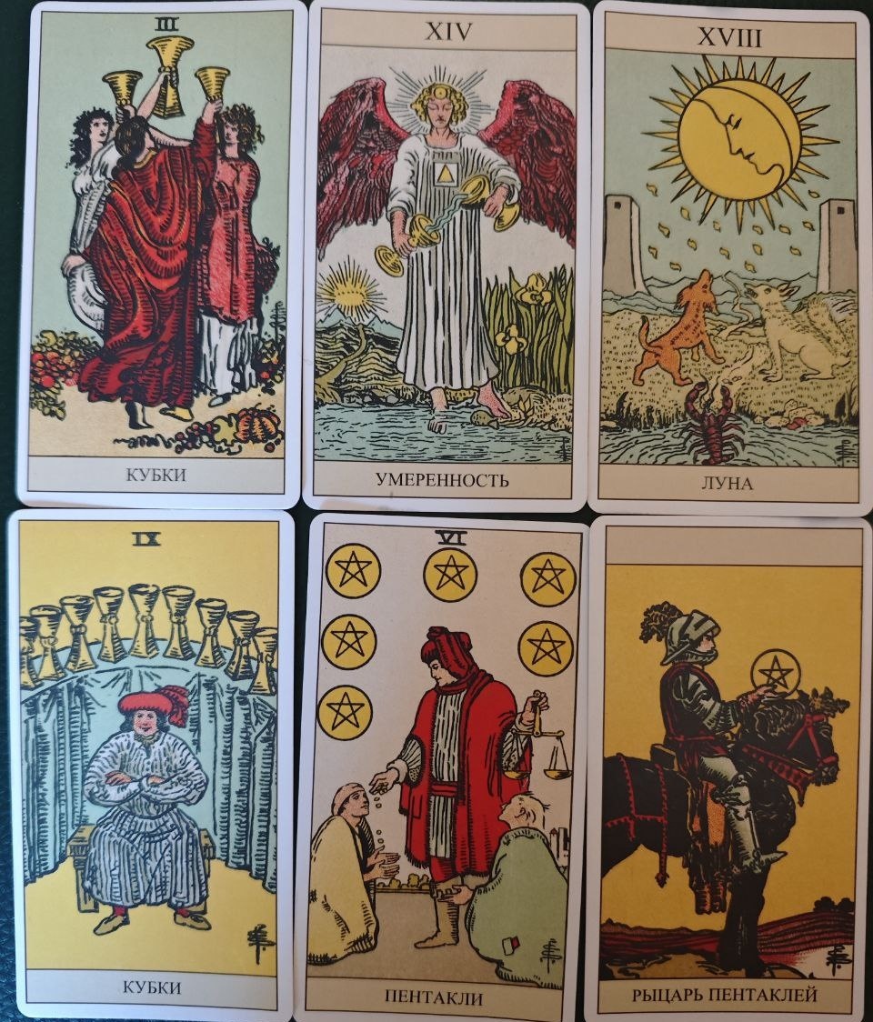 Карты: 3 Кубков, Умеренность, Луна, 9 Кубков, 6 Пентаклей, Рыцарь Пентаклей.