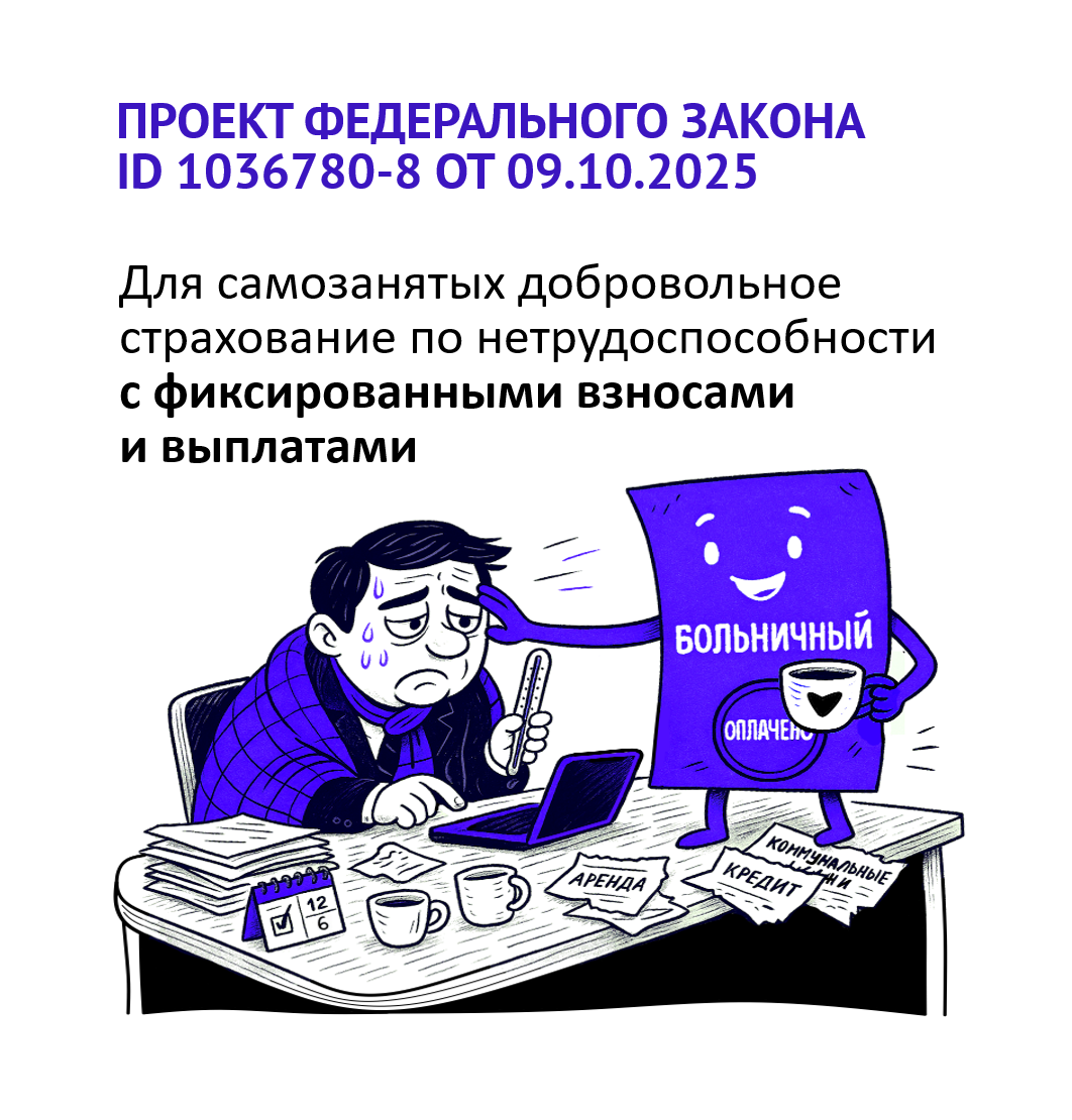 Предлагается провести эксперимент с 1 января 2026 по 31 декабря 2028, в рамках которого самозанятые смогут добровольно вступать в правоотношения с Фондом пенсионного и социального страхования для получения пособий по временной нетрудоспособности, это позволит получать финансовую поддержку во время болезни, проект Федерального закона № 1036780-8.