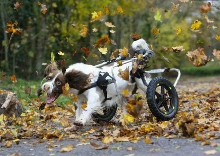 Этот чудесный пес словно живет в своем фильме про счастье: вокруг кружатся осенние листья, а он мчится вперед на своих колесах, не замечая никаких жизненных сложностей! Глаза полны восторга, уши развеваются как крылья, и даже без задних лап он ловит кайф от каждой минуты.