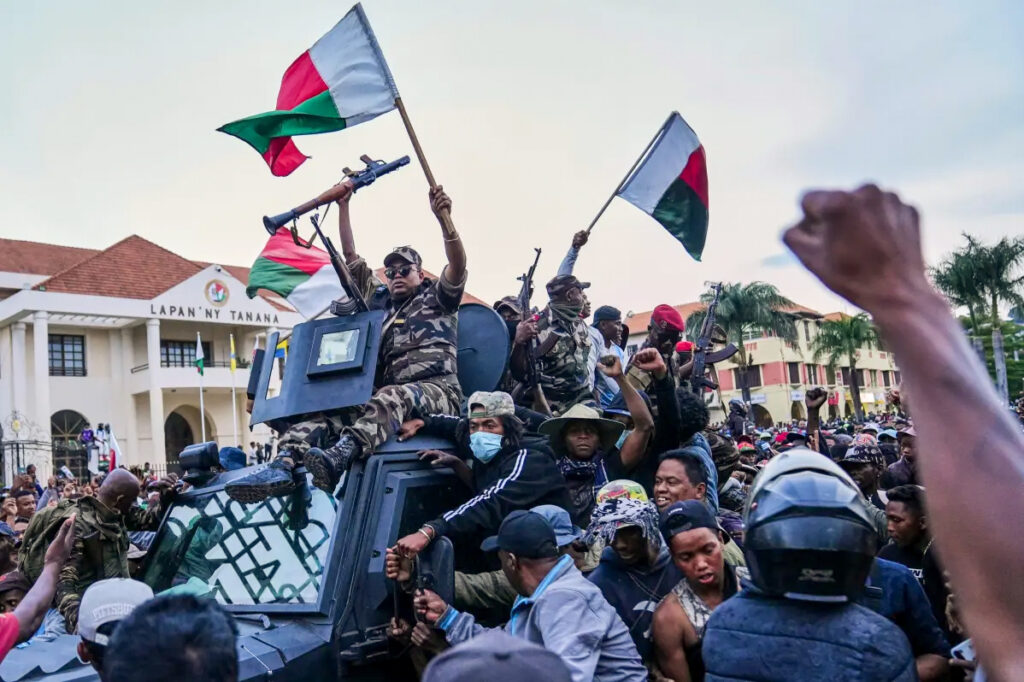 На Мадагаскаре после трехнедельных протестов поменялась власть, которую взяли в свои руки военные, а президент Андри Радзуэлин покинул страну. О взятии власти днем 14 октября объявил командир элитного воинского соединения CAPSAT полковник Майкл Рандрианирина. Офицер заявил, что в стране приостановлена работа большинства институтов государственной власти, включая конституционный суд, сенат (верхнюю палату парламента) и избирательную комиссию. Национальное собрание, являющееся нижней палатой парламента, продолжает свою работу видимо потому, что за несколько минут до перехода власти к военным оно проголосовало за импичмент президента. Легитимность такого решения можно поставить под сомнение, ибо еще до этого президент Радзуэлин своим декретом распустил нижнюю палату парламента, но депутаты проигнорировали это решение, заявив о сохранении своих полномочий. Президент покинул страну еще в минувший понедельник предположительно на французском военном самолете с согласия президента Франции Макр